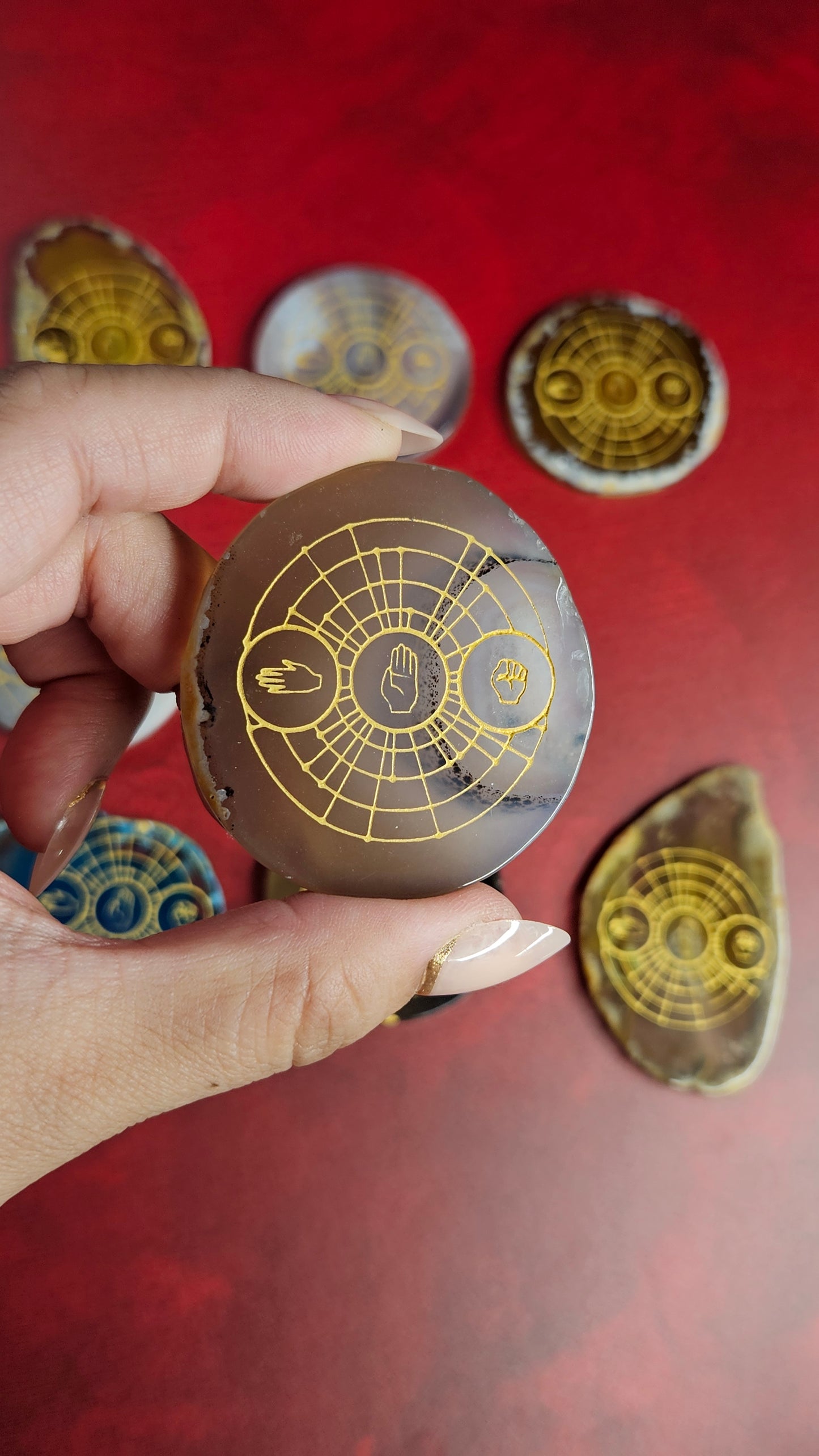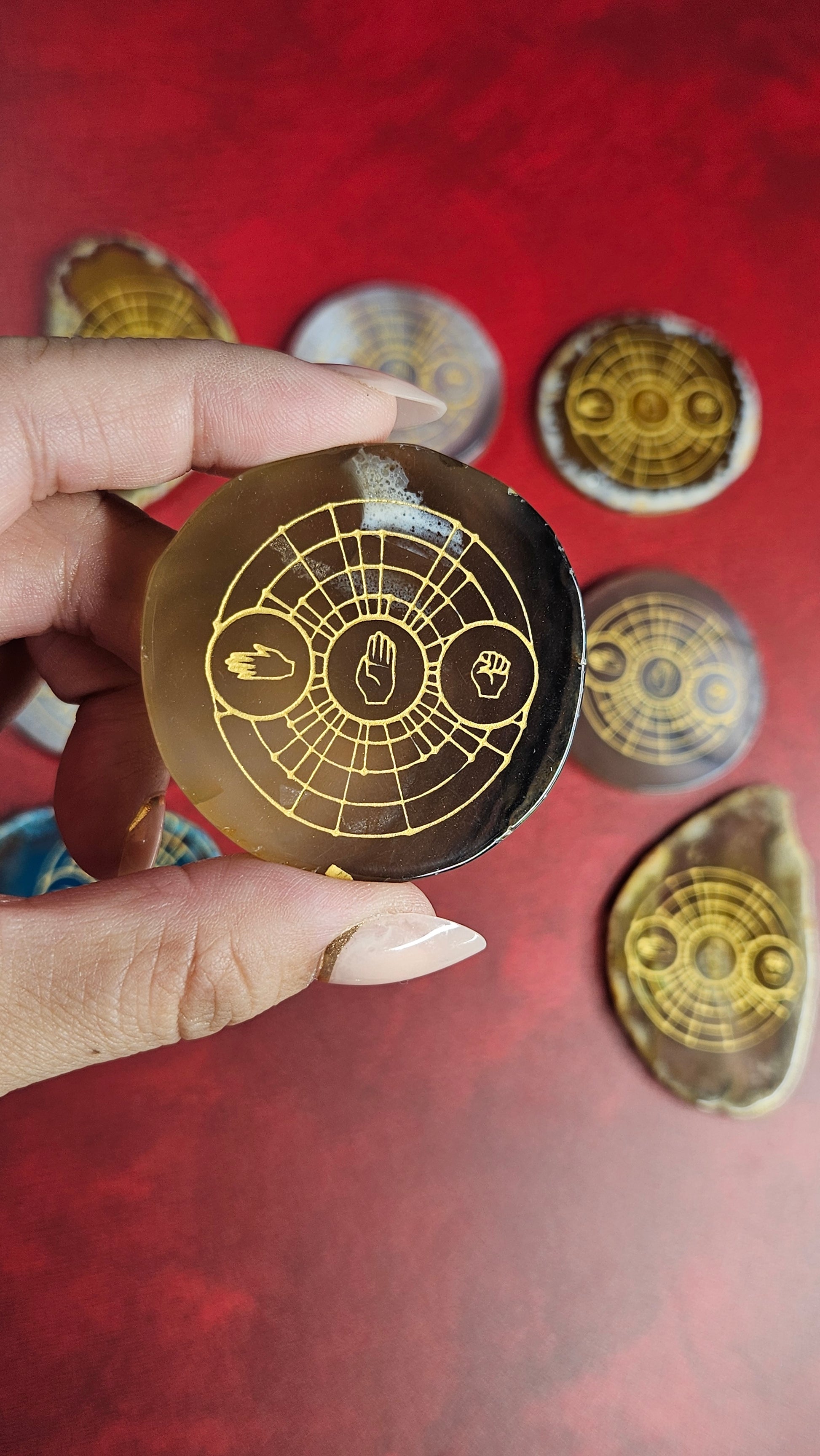 These mini agate slabs are a fun and unique take on owning your own access key to the World Between Worlds! Natural crystals formation with the Mortis gods symbols!